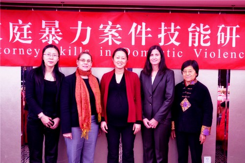 (图片左起依次为:赵丽娜律师、美国律师协会家庭暴力委员会主席罗宾朗杰教授、美国律师协会中国项目办公室卢炫周主任、维拉司法研究所监督主任反家暴和性暴力领域专家凯瑟琳卡罗尔女士、北京大学于蓉老师)